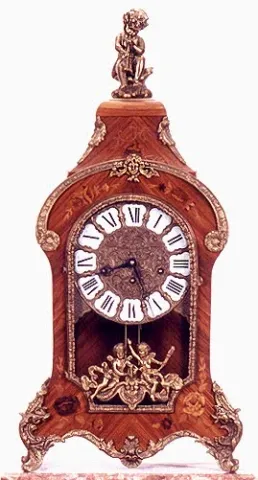 baroque styling with ormolu mounts, cherub figural crest, with German made movement, Westminster chime. Raised white porcelainized Roman numerals, gla...