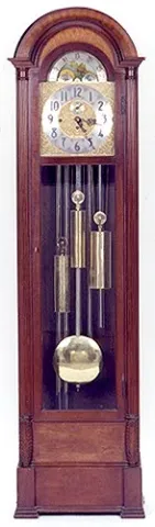 mahogany cased, 3-weight, 5-tube, moonphase/calendar dial, seconds dial, 80"H....