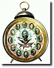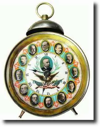 C.1899, POLITICAL Alarm clock dated dial, Regent Mfg, , in excellent original condition. At first we thought they were presidents around the outside of the dial, but in 1899 Roosevelt was the young fellow that you see in the image. Since Dewey appears in the center, perhaps they were his political allies. They all appear to be in military blues, so perhaps they were West Point graduates? In any case the dial is in remarkable condition and certain to be of interest to those interested in U.S. history. Small dent in case, lower right. Height 6 " $900-1200
