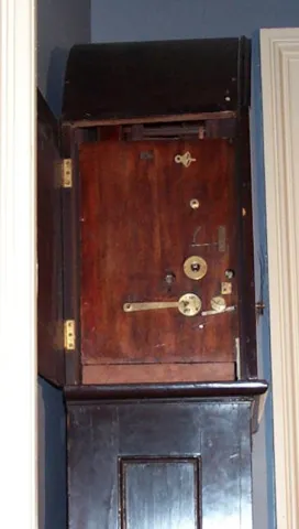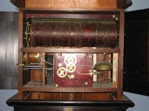A very rare floor standing organ clock, playing 8 tunes on 38 wooden pipes. It is an eight day clock striking the hours on a cast bell. The movement h...