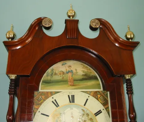 English tallcase with figured mahogany and solid turned pillars on the hood. The hood has a swan -neck pediment with roundels, three brass finials and...