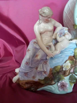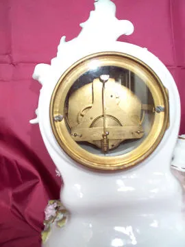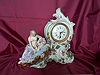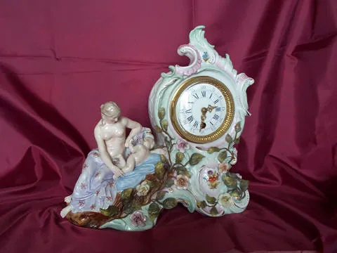 A "Sitzendorf" porcelain mantel clock with its "blue mark under glaze." Mother and child are surrounded by many beautiful flowers. All the porcelain i...