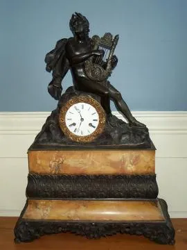 IMPRESSIVE SIENNA MARBLE and BRONZE TABLE CLOCK -HAS PORCELAIN DIAL, SILK THREAD SUSPENSION. BEAUTIFUL STATUE OF APOLLO, PLAYING HIS HARP. APOLLO WAS ...