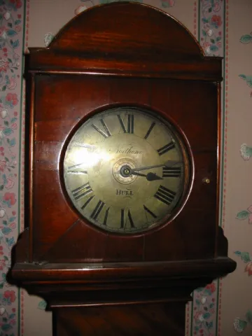A unique early English wall clock in a figured mahogany case. The hook and spike movement has a brass dial signed: Northen , HULL It is time and alarm...