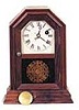 Signed brass movement is 30 hour, strikes a coil gong. 15 1/2 inch metal case front, wood box in back holding the movement. Dial pan and bezel are ori...