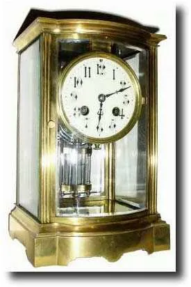 C.1900, France, H and H, Bow Front crystal regulator with mercury pendulum in good condition. There is a minor chip, lower right in rear beveled glass; rest is intact. Good porcelain dial with Gothic styled Arabic numerals, original hands, gong, etc. Well made movement is signed Marti (+H and H), runs OK and is striking on a coiled wire gong. Height 9" $400-500
