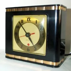 Alarm. Square black Bakelite Body with Brass Bands, Yellow, Gold and Black Face. Condition, Mint. 4 3/4" tall by 5 1/8" x 2 "....