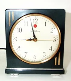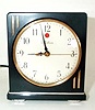 Black Bakelite Body with Gold Bands. Silver Feet, White Face. Designed by Kurt Rettich. Condition Excellent. 4 1/4" by 3 3/4" x 2"....