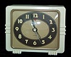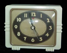 Alarm. Off-white Bakelite with two tone face. Brass bezel. Deco detailed sides and feet. Designer: Leo Ivan Bruce. Condition, Mint. 4 1/8" tall by 4 3...