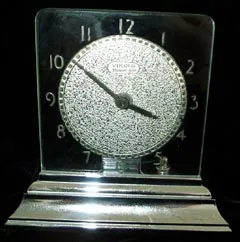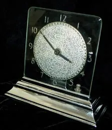 Stepped Chrome Base, Square Glass Face, Textured Silver Dial, Painted Numbers. Light with switch. Condition Excellent . 7 1/2" x 7 1/2" x 3 1/2"....