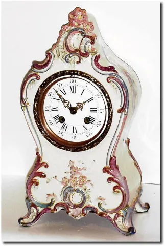 C.1900, French, a Porcelain China Clock in beige with saccents in rose pink and light blue. Has a good round bell strike movement, signed with "C-J' over an anchor, and numbered 2233 and with matched number pendulum. The shortcomings on this clock are a porcelain dial filled with spider lines and a repaired case. The back was broken out, repaired and reglazed. Runs and looks OK; height 12' Would be $600 if perfect.