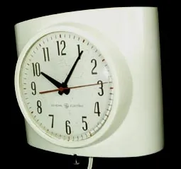 Square, Off White Plastic Body with Round Sides, Round Face. Condition: Good. 5 1/2" x 7" x "....