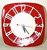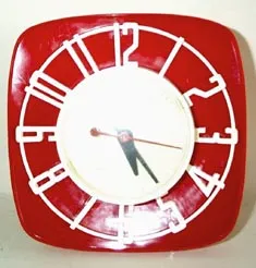 Round Cornered Square Red Plastic Body, Raised White Numbers and Round Face. Condition: Excellent. 6" x 6" x 2"....