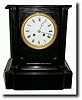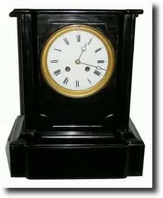 C.1900, French black marble mantle clock in generally good condition, except as noted. The strike hammer was repaired with solder and looks a bit out of character with the clock. There are minor edge chips to the marble, but no cracks and surfaces are smooth; some stains on top from a doily. Has a quality round movement that strikes the hours and halves on a gong. Porcelain dial is good except for some abrasion around the winding holes from using a key too large. Original hands and original pendulum, no. 1847, matches movement. Runs but would benefit from service; take care in opening bezel as it is very tight. Height 13" $125-175