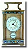 C.1900, French, Brass Cased Carriage Clock, time and alarm, with a jeweled sash and with multicolor cloisonné bands top and bottom. Both the dial and movement are signed: J.E. Caldwell, Philadelphia (dial sig weak). The dial also with polychrome floral wreaths within the numerals. Original lever platform intact; an attractive little clock; Height 5" $950-1050