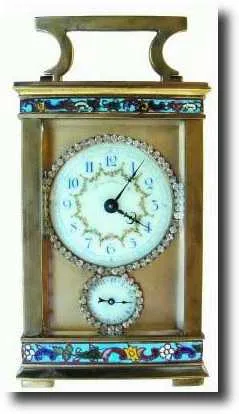 time and alarm, with a jeweled sash and with multicolor cloisonné bands top and bottom. Both the dial and movement are signed: J.E. Caldwell, Philadelphia (dial sig weak). The dial also with polychrome floral wreaths within the numerals. Original lever platform intact; an attractive little clock; Height 5" $950-1050