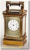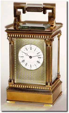 C.1900, French, Brass Cased Carriage Clock time, strike, repeat and alarm, in a classic Anglais Riche case with fluted Corinthian columns and fluted handle. This clock has a striped and spotted dial mask with a porcelain dial signed for the retailer: G. Edward and Sons, London and Glasgow. Retains original hands, dial with gilt minutes and lever platform. The well made movement is numbered 6172 and is going. All beveled glass is good. A substantial clock in excellent condition; height 7.9'