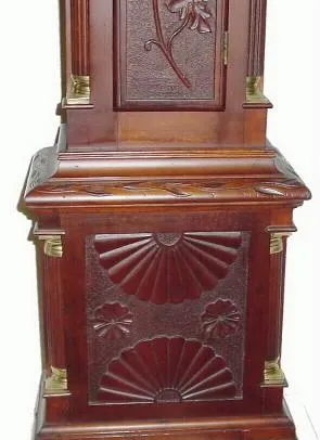 The well detailed mahogany case has classic Chippendale styling with reeded side columns on the base, trunk and hood. In addition the center door is n...