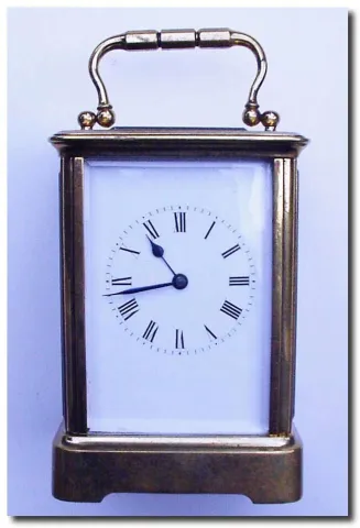 C.1900, French, Brass cased time only carriage clock, signed E-J-P, in good original condition. This is a nice small carriage clock and retains original lever platform, good porcelain dial and original hands. Runs briskly. Owing to the size, signature and condition, this clock is worth an extra amount. Height (handle up), 4.9'