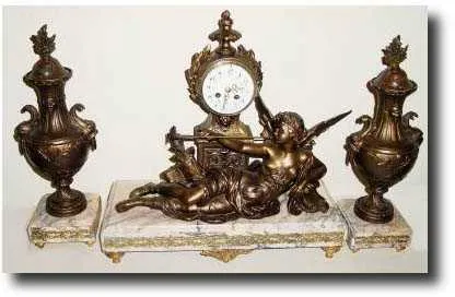 C.1900, French, Bronzed Spelter Clock Garniture Set , a reclining female angel with trumpet, and with matching urns with covers, with restoration. This is a large and heavy set, note the base of the clock alone is 20 inches wide. The well made bell strike movement in good order, and with good porcelain dial with polychrome wreath decorations and original gilt hands. Very impressive; Height 20 inches $700-900