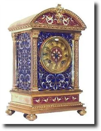 in an architectural style. The gilded case is decorated in red white and blue cloisonne` . This is a little gem, quite cute, standing only 8.5" high. Has a small and well made French pendulum movement and strikes on a gong. See also lot 434. Clean and working; reserve $1500