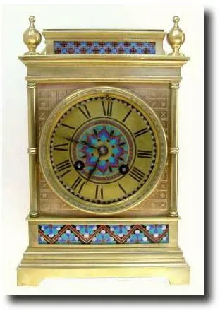 in an architectural style. The front only of the gilded case is decorated in red white and blue cloisonne` . See 'cousin' to this clock, lot 432. This one is not as elaborate, but is still very well made and eye catching. The images of these are deceiving as the clocks are small. The dial signed Edward and Sons, Paris, London and Glasgow. 8-day time and strike pendulum movement. Height 8" Reserve $900