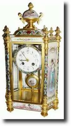 with Limoge type panels on either side, and profusely decorated case, top and bottom and with portrait pendulum. The fellow who consigned this clock bought it in a hurry from a fast talking salesman who failed to mention that the movement was from another French clock and the dial plate had been soldered in order to adapt it to this case. The pendulum does match the case and a second slot has been filed to meet the crutch. The case is beautiful, but you will have to budget for improving the dial plate or finding another movement altogether. Worth $3500 if correct; runs. Height 15" $2000-2500