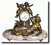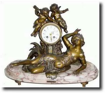 (after Moreau), bronzed spelter on marble mantel clock and in excellent original condition. The reclining nymph in a lovely pose, and above the clock two cupids with arrows. See detail images of dial and plaque with name of statue and artist. This is a large and heavy clock, width 20 inches, Height 19" $500-700