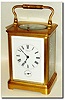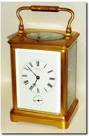 C.1900, French for Tiffany and Co, New York, (original dial signature very good), brass cased carriage clock, time, petite sonnerie, full repeat, and alarm. For the regular quarters, you get a bim-bam sound (1, 2 or 3) for each quarter; on depressing the repeat button, you get the hour, followed by the quarters. This clock is in very good original condition, with frosty gilding intact, original platform sound, and glass + dial are in excellent condition. A very pleasant carriage clock; Height 7'