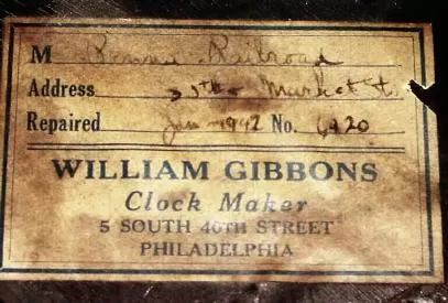 from the Pennsylvania Railroad station at 35th and Market Sts, Philadelphia. See detailed repair label from Wm. Gibbons, Philadelphia, who serviced th...