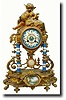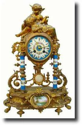C.1900, French Gilded Spelter Fantasy Clock in a portico style with porcelain columns and central plaque, the matching dial also hand painted with a floral wreath and with gilt hands. The well made round French movement is signed Ls. Roussy a Toulouse. Note interesting grid pendulum with a small piece of white marble in the center. There are a couple of pieces of spelter soldered back on, center plaque with old crack; generally very good condition and running. Height 18" $600-900