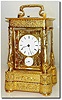 This is a classic case-on-case format, the 2-tune Swiss music box in the lower one inch base section. A case similar to this is in the Rockford Museum Collection, catalog no. 2342, and is illustrated in A Century of Fine Carriage Clocks, by Fanelli and Terwilliger, page 126. That clock has a glass enclosed automaton on top, in lieu of the finely cast top this one bears. The well made movement is an hour striker on a bell. The music is actuated by the alarm mechanism and plays until wound down. This clock has been restored, and the gold plating is fresh. Screws with heads a bit too large are holding in the music box and this should be addressed; the minute hand is slightly bent. Heavily beveled glass is all perfect. A large clock; height 9º'