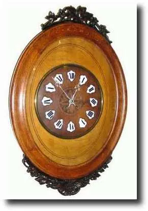 C.1900, French, Oak Oval Frame Wall Clock with hand carvings top and bottom. Note the top carving had come off at some time and the Frenchman who put it back on had consumed too much wine, and it is over 2" to the right of center. Otherwise this is a LARGE and interesting clock, with a 12" dial and 33" overall length. Retails a good French movement and strikes the hours and halves on a gong. Note porcelain numeral III is turned slightly in photo - it is not damaged. Height 33" $225-325