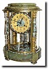 in immaculate condition. This is as good as it gets. Note 4 column case with each column, floor of case top and bottom bands, feet and pendulum all decorated with colorful red, green and blue enamel; the whole offset by a green onyx top and bottom. Quality Japy Freeres movement strikes the hours on a gong. Dial is signed Davis Collamore and Co., Broadway, New York. If you want only one French crystal regulator, this is the one. See also lot 298 if you prefer rectangular form. Height 12 " (32cm) Reserve $2100