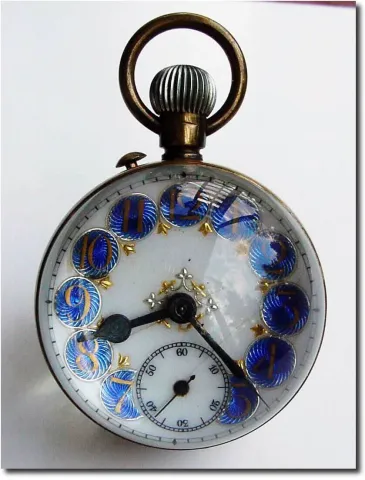 The dial has hairline cracks and the hands are both replacements, however it is in good running order and generally in good condition, with no chips in the glass. Robust stemwind movement is marked "France' Diameter1.7'