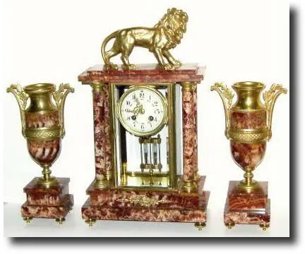 C.1900, French, Red Onyx 3-Piece Crystal Set in very nice condition. There are some hairlines in the fancy porcelain dial that only show on the closest inspection - totally absent in the photos shown. Otherwise, this is a great set with fabulous ormolu mounted urns and the clock itself surmounted by a detailed and well chased lion. The gilding on all the parts is still bright. The quality bell strike movement is numbered 47888 and with pendulum length given as 140mm (I wish they all used that format). Lacy cast hands; original mercury pendulum intact. You do not often see this red and white mottled onyx; very impressive. Height 19" Reserve $1200