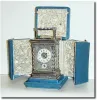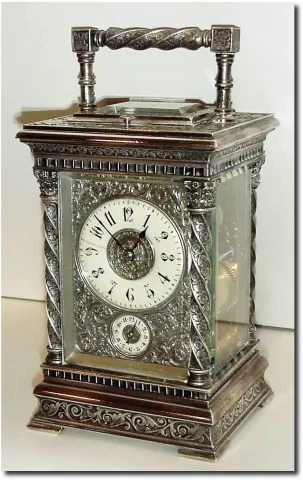 C.1900, French, Silver Plated, Engraved carriage clock with ivory dials, time, strike, repeat and alarm. The quality of the engraving on this piece is exceptional, all 4 twisted columns with fine pansies, and the base and top with extensive scrolls. The ivory time dial has a crack at 9:30, but is otherwise perfect. The mask around the dial is deeply engraved with vines and blossoms. The case is numbered (26251) and with matching numbered key; the quality movement bearing both the 26251 and movement number 14296. Original lever platform intact and running. Also with original blue silk covered travel and display case (less strap) Note the silver plating is substantial and no brass is showing through. Height of clock 7.25' height of case 7.75'
