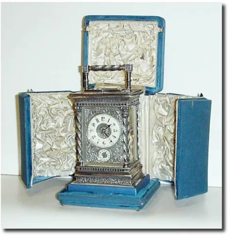 The quality of the engraving on this piece is exceptional, all 4 twisted columns with fine pansies, and the base and top with extensive scrolls. The ivory time dial has a crack at 9:30, but is otherwise perfect. The mask around the dial is deeply engraved with vines and blossoms. The case is numbered (26251) and with matching numbered key; the quality movement bearing both the 26251 and movement number 14296. Original lever platform intact and running. Also with original blue silk covered travel and display case (less strap) Note the silver plating is substantial and no brass is showing through. Height of clock 7.25' height of case 7.75'