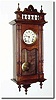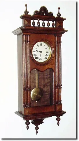 Has a great walnut 4-column case with carved top. The movement is a heavy iron framed Morez job with "prayer repeat', repeating the hour strike at 2 minutes past each hour. The photo is deceiving, so check dimension. Dial diameter is 5.5'. One hinge is loose on door and strike hammer needs adjusting; otherwise mechanically sound; height 35'