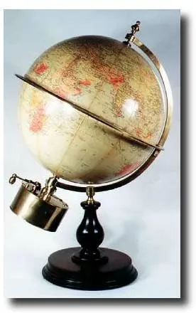 This is a large and impressive globe (13") in remarkably good condition. The small oval with the globe makers name has been painted over, and is illegible, however the paper surface is otherwise in very good condition, crisply legible, with bright colors for the continents. There are some bits of the equator seam strip missing, and this should be attended. The globe and clock assembly are supported by a turned wooden base. The quality clock movement is housed in a 5" brass canister, and driven by a heavy spring wound with a music-box-style ratchet lever winder. A single brass hand extending from the North Pole can be positioned at your city of choice and the time read off the chapter ring at the equator (numbered I-XII twice). Such globes were popular in schools and libraries around the turn of the 20th Century. Height 23.5" Reserve $7500