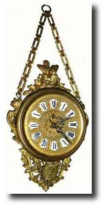 clock copied, as the castings and chain design are identical. This one has a small French 8-day pendulette movement, with the sunburst pendulum visible below the dial. Winds at 12. Total Height 21 inches $175-275