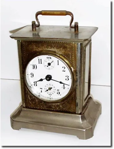 C.1900, German, Musical Alarm clock, nickel over stamped steel construction, alarming with the tune of "Dixie'.