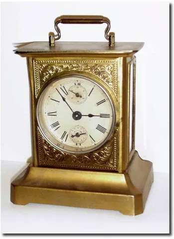 C.1900, German, Musical Alarm clock, stamped steel construction, now painted gold, alarming with two good tunes:"Bicycle Built for Two' and "My Country "Tis of Thee'.