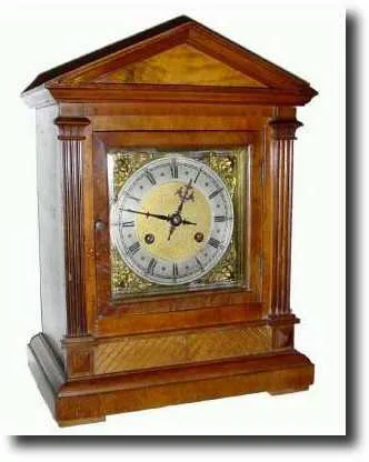bracket clock in architectural style, and in fair to good condition. This clock runs OK, and retains original finish, but suffered some wood worm dama...