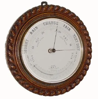 C.1930, English, Aneroid Barometer, wall model, in a carved oak case with rope twist edge, and in good original condition.