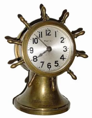 C.1925, Waterbury, ENSIGN, desk timepiece, ships wheel motif, with rim wind and lever set 8-day jeweled movement.