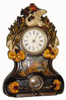 This clock is an incredible expression of Victorian exuberance. The case is molded with cranes, flowers, bull rushes, water plants and so on, all hig...