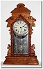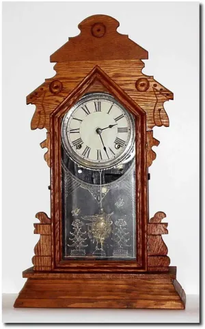 C.1900, Mixed lot: An Ingraham oak kitchen clock case, with replaced top and bottom moldings, poorly refinished and with a new tablet, NOW with an Gilbert 8-day movement, repapered dial, and incorrect gong.