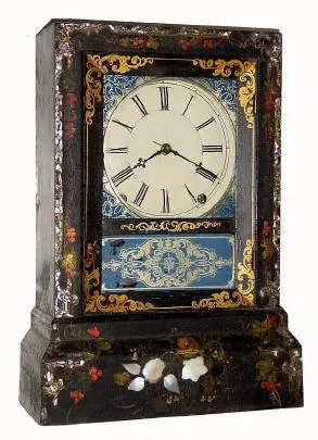 C.1848, Terry and Andrews, Stenciled, painted and MOP inlaid wooded cased, 8-day shelf clock in very good original condition.