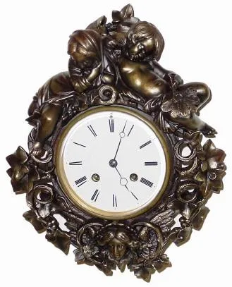 This is a cute clock depicting 2 children sleeping at top and a winged angel at the bottom. Has a well made bell strike movement, regular pendulum wit...